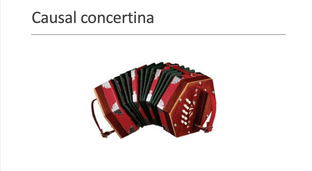 - ‘But behaviour itself comes from a long chain of interactions with the world as you develop‘ – Let’s illustrate this idea with an example we call the causal concertina. A concertina is an instrument whose sound is generated by stretching and squeezing a central bellows, but here, trust us, we’re using it as a metaphor.