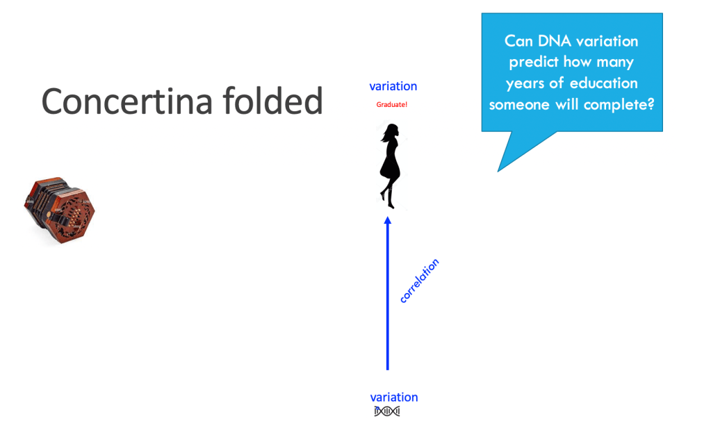 - Let’s consider correlating genetic variation, perhaps even of individual letters of DNA, with how many years you spend in education, like these guys do. We can think of this as a correlation when the concertina is squeezed and so the developmental process is hidden in the folds.