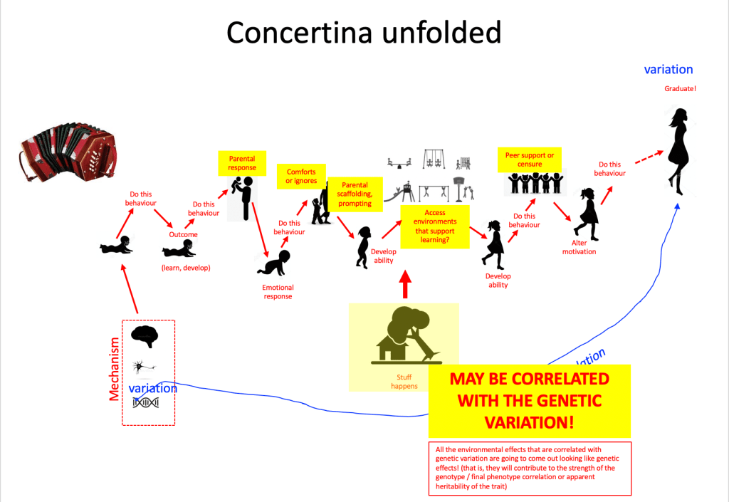 - For sure, you can still run that correlation between genetic variation and final educational attainment, but now you can see how far you are reaching across development, and how many interactions with the environment you are collapsing over. Crucially, a bunch of those environments you interact with (those shown in yellow below) are likely to be correlated somewhat with your genetic variation. For example, how your parents react to your behaviour (comfort you or scold you) – they share your genes; the richness of your home or neighbourhood resources – they in part reflect your parents’ station in life, partly influenced by their genes, which you share; the peer group you choose for yourself (party people or thoughtful discussion group) – your choices are partly influenced by your genes. Together, this means that contributions of genetic variation to brain development or function become thoroughly entwined with environmental influences across lifespans. Yes, it’s true, the measured genetic variation may seem to predict half of the variation in outcomes when the concertina is folded, but this hides a complex web of developmental processes.