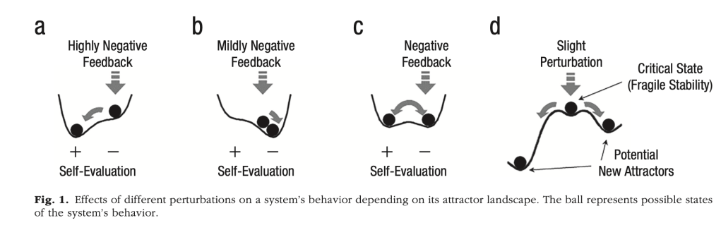 - Ah, but in the end, we didn’t think we could make the metaphor fly, so we include it here just for fun. But if you’re interested in dynamical systems – ones that exhibit internal states which evolve over time and interact with externally applied input – then this book gives a good introduction to dynamical systems theory in the context of neurocomputation and development: Spencer, J., Thomas, M. S. C., & McClelland, J. L. (2009). Toward a new unified theory of development: Connectionism and dynamical systems theory re-considered. Oxford: Oxford University Press. And if you’re interested in a dynamical systems perspective on psychiatric disorders, here’s an illustrative paper that focuses on depression within this framework: Cramer AOJ, van Borkulo CD, Giltay EJ, van der Maas HLJ, Kendler KS, Scheffer M, et al. (2016) Major Depression as a Complex Dynamic System. PLoS ONE 11(12): e0167490. doi:10.1371/journal.pone.0167490. And if you interested in how you can characterise the normal functioning of the cognitive system in terms of attractor states, see: Gernigon, C., Den Hartigh, R. J. R., Vallacher, R. R., & van Geert, P. L. C. (2023). How the Complexity of Psychological Processes Reframes the Issue of Reproducibility in Psychological Science. Perspectives on Psychological Science, 0(0). https://doi.org/10.1177/17456916231187324. Figure 1 gives a flavour of those attractors, in this case showing how an individual’s self-evaluation may be influenced by feedback. Different systems have different dynamics and attractor ‘landscapes’, so that externally dlivered feedback produces different responses: