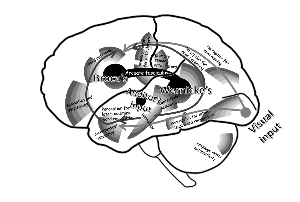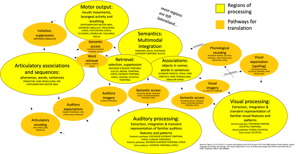 - Here’s our best schematic of the language brain based on Price’s (2012) synthesis, but it wasn’t pretty enough, or indeed comprehensible enough, to make it into the book. The ‘grey rainbows’ represent sensory or motor hierarchies, the schematic shows the two routes from perception to action (separately for oral and written modalities), the mechanisms for sequencing and retrieval, and the two semantic stores, contextual and a-contextual, as well as Broca’s and Wernicke’s areas as linked hubs.